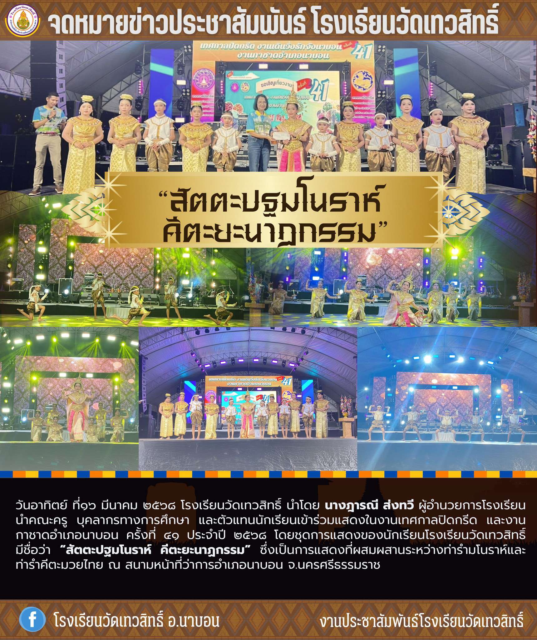วันอาทิตย์ ที่๑๖ มีนาคม ๒๕๖๘ โรงเรียนวัดเทวสิทธิ์ นำโดย นางฎารณี ส่งทวี ผู้อำนวยการโรงเรียน นำคณะครู บุคลากรทางการศึกษา และตัวแทนนักเรียนเข้าร่วมแสดงในงานเทศกาลปิดกรีด และงานกาชาดอำเภอนาบอน ครั้งที่ ๔๑ ประจำปี ๒๕๖๘ โดยชุดการแสดงของนักเรียนโรงเรียนวัดเทวสิทธิ์ มีชื่อว่า “สัตตะปฐมโนราห์ คีตะยะนาฏกรรม” ซึ่งเป็นการแสดงที่ผสมผสานระหว่างท่ารำมโนราห์และ ท่ารำคีตะมวยไทย ณ สนามหน้าที่ว่าการอำเภอนาบอน จ.นครศรีธรรมราช
