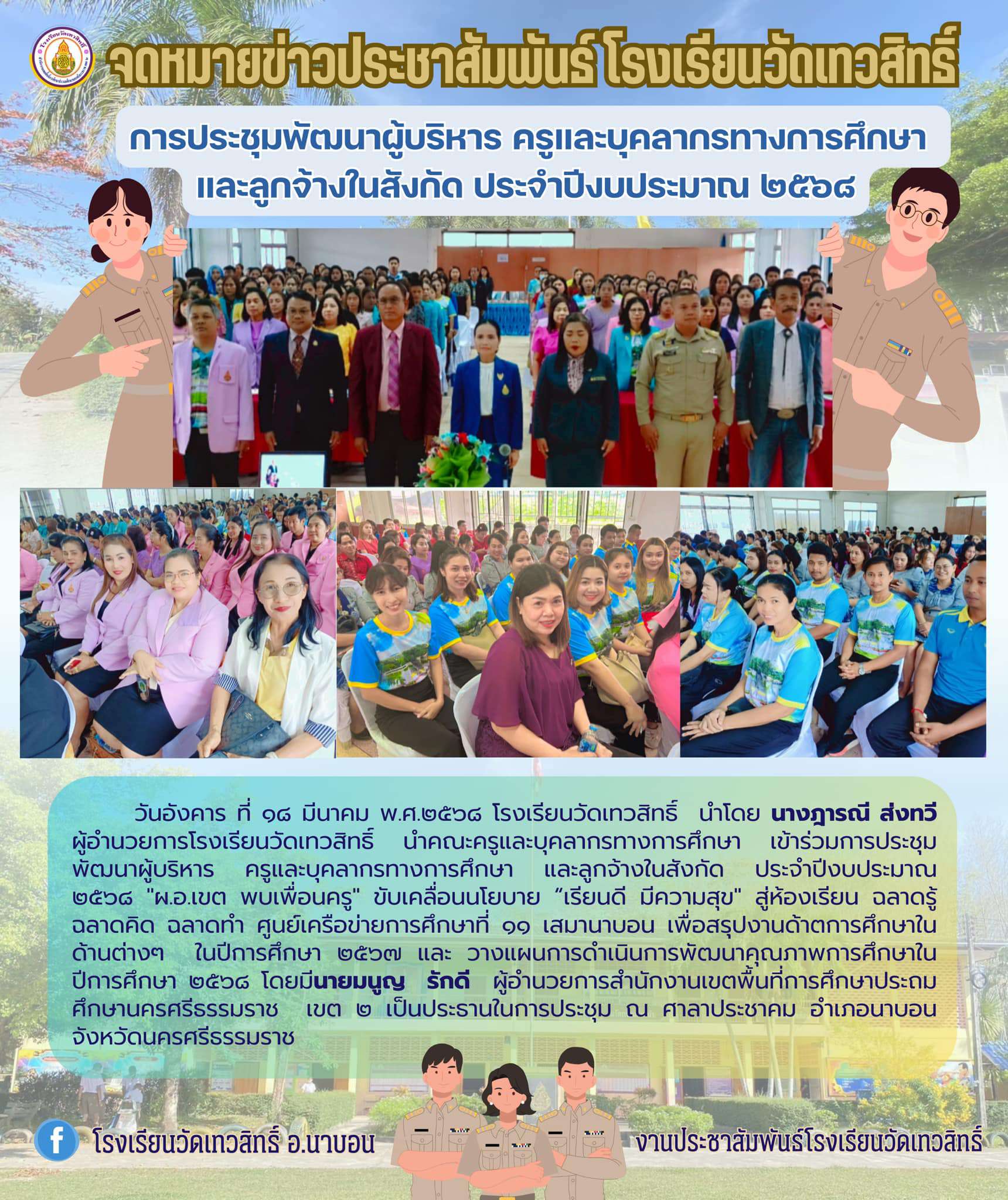 วันอังคาร ที่ ๑๘ มีนาคม พ.ศ.๒๕๖๘ โรงเรียนวัดเทวสิทธิ์ นำโดย นางฎารณี ส่งทวี ผู้อำนวยการโรงเรียนวัดเทวสิทธิ์ นำคณะครูและบุคลากรทางการศึกษา เข้าร่วมการประชุมพัฒนาผู้บริหาร ครูและบุคลากรทางการศึกษา และลูกจ้างในสังกัด ประจำปีงบประมาณ ๒๕๖๘ "ผ.อ.เขต พบเพื่อนครู" ขับเคลื่อนนโยบาย “เรียนดี มีความสุข" สู่ห้องเรียน ฉลาดรู้ ฉลาดคิด ฉลาดทำ ศูนย์เครือข่ายการศึกษาที่ ๑๑ เสมานาบอน เพื่อสรุปงานด้าตการศึกษาในด้านต่างๆ ในปีการศึกษา ๒๕๖๗ และ วางแผนการดำเนินการพัฒนาคุณภาพการศึกษาใน ปีการศึกษา ๒๕๖๘ โดยมีนายมนูญ รักดี ผู้อำนวยการสำนักงานเขตพื้นที่การศึกษาประถมศึกษานครศรีธรรมราช เขต ๒ เป็นประธานในการประชุม ณ ศาลาประชาคม อำเภอนาบอน จังหวัดนครศรีธรรมราช