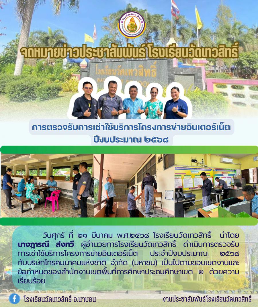 วันศุกร์ ที่ ๒๑ มีนาคม พ.ศ.๒๕๖๘ โรงเรียนวัดเทวสิทธิ์ นำโดย นางฎารณี ส่งทวี ผู้อำนวยการโรงเรียนวัดเทวสิทธิ์ ดำเนินการตรวจรับ การเช่าใช้บริการโครงการข่ายอินเตอร์เน็ต ประจำปีงบประมาณ ๒๕๖๘ กับบริษัทโทรคมนาคมแห่งชาติ จำกัด (มหาชน) เป็นไปตามขอบเขตงานและข้อกำหนดของสำนักงานเขตพื้นที่่การศึกษาประถมศึกษาเขต ๒ ด้วยความเรียบร้อย