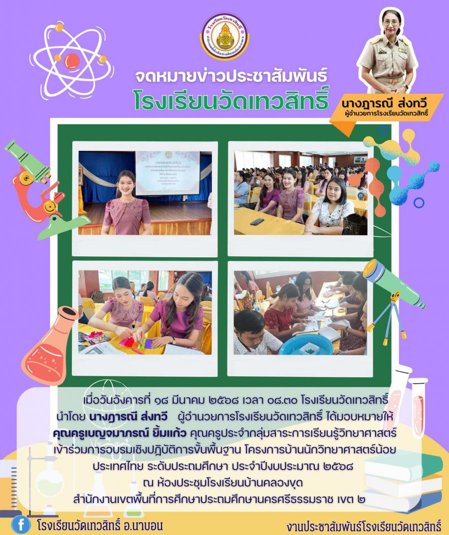 โรงเรียนวัดเทวสิทธิ์ นำโดย นางฎารณี ส่งทวี ผู้อำนวยการโรงเรียนวัดเทวสิทธิ์ ได้มอบหมายให้ คุณครูเบญจมาภรณ์ ยิ้มแก้ว คุณครูประจำกลุ่มสาระการเรียนรู้วิทยาศาสตร์ เข้าร่วมการอบรมเชิงปฏิบัติการขั้นพื้นฐาน โครงการบ้านนักวิทยาศาสตร์น้อย ประเทศไทย ระดับประถมศึกษา ประจำปีงบประมาณ ๒๕๖๘ ณ ห้องประชุมโรงเรียนบ้านคลองขุด สำนักงานเขตพื้นที่การศึกษาประถมศึกษานครศรีธรรมราช เขต ๒