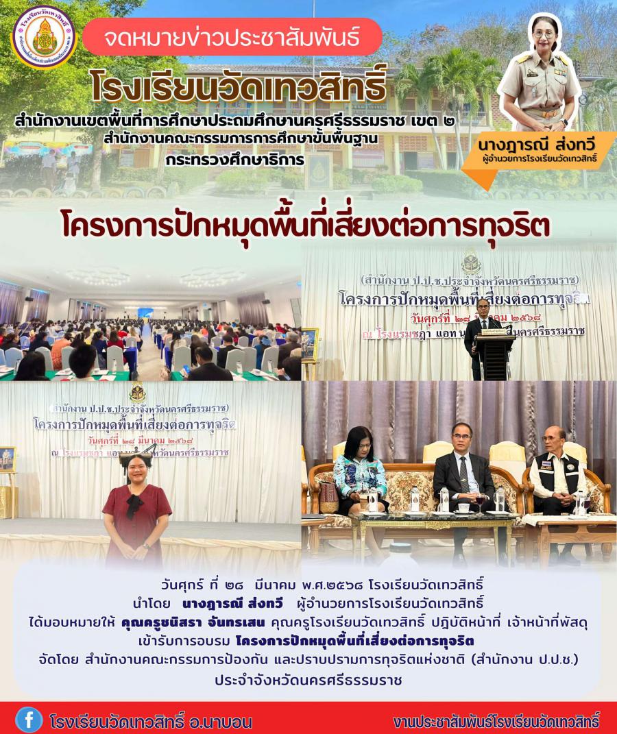นำโดย นางฎารณี ส่งทวี ผู้อำนวยการโรงเรียนวัดเทวสิทธิ์ ได้มอบหมายให้ คุณครูชนิสรา จันทรเสน คุณครูโรงเรียนวัดเทวสิทธิ์ ปฎิบัติหน้าที่ เจ้าหน้าที่พัสดุ เข้ารับการอบรม โครงการปักหมุดพื้นที่เสี่ยงต่อการทุจริต จัดโดย สำนักงานคณะกรรมการป้องกันและปราบปรามการทุจริตแห่งชาติ (สำนักงาน ป.ป.ช.) ประจำจังหวัดนครศรีธรรมราช