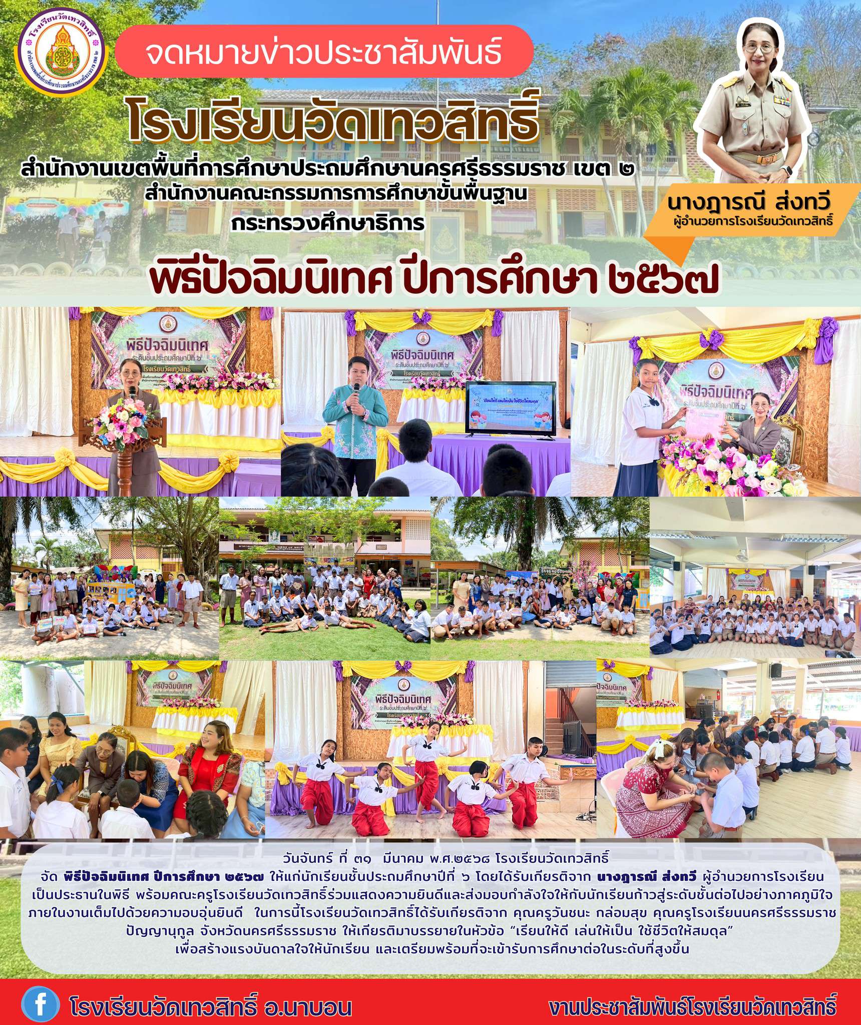 จัด พิธีปัจฉิมนิเทศ ปีการศึกษา ๒๕๖๗ ให้แก่นักเรียนชั้นประถมศึกษาปีที่ ๖ โดยได้รับเกียรติจาก นางฎารณี ส่งทวี ผู้อำนวยการโรงเรียนเป็นประธานในพิธี พร้อมคณะครูโรงเรียนวัดเทวสิทธิ์ร่วมแสดงความยินดีและส่งมอบกำลังใจให้กับนักเรียนก้าวสู่ระดับชั้นต่อไปอย่างภาคภูมิใจ ภายในงานเต็มไปด้วยความอบอุ่นยินดี ในการนี้โรงเรียนวัดเทวสิทธิ์ได้รับเกียรติจาก คุณครูวันชนะ กล่อมสุข คุณครูโรงเรียนนครศรีธรรมราชปัญญานุกูล จังหวัดนครศรีธรรมราช ให้เกียรติมาบรรยายในหัวข้อ “เรียนให้ดี เล่นให้เป็น ใช้ชีวิตให้สมดุล” เพื่อสร้างแรงบันดาลใจให้นักเรียน และเตรียมพร้อมที่จะเข้ารับการศึกษาต่อในระดับที่สูงขึ้น